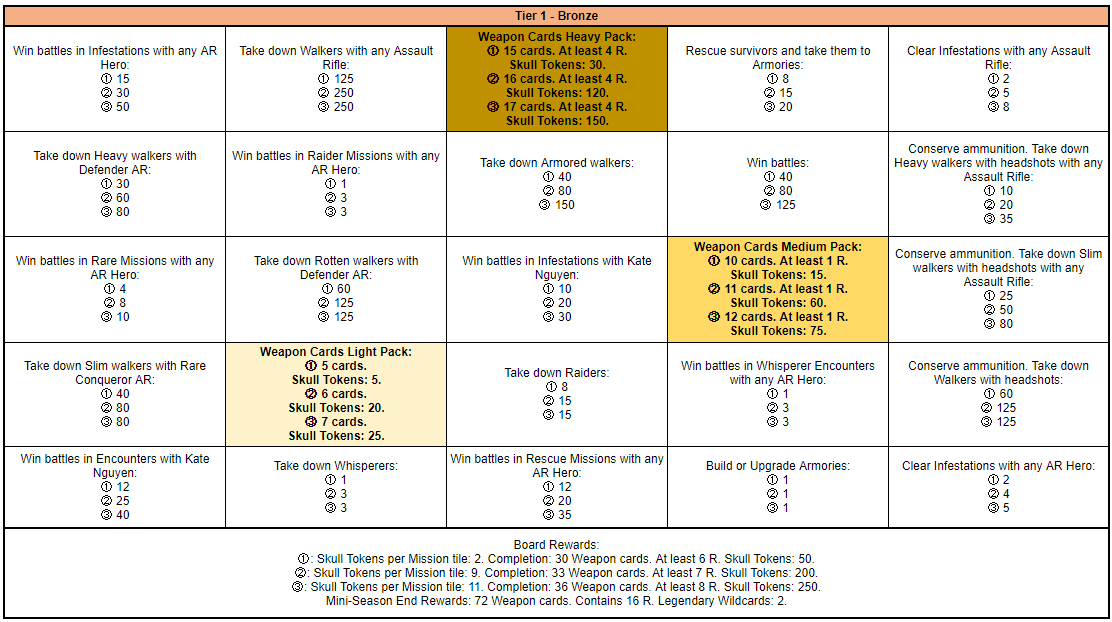 Completing Group Boards, Tiles and claiming Packs between Tiers 1 to 5 will reward you with Skull Tokens that can be exchanged in the Mini-Season Shop for prizes. Skull Tokens received per tile, per pack and by completing Group Boards can be found in the Forum.