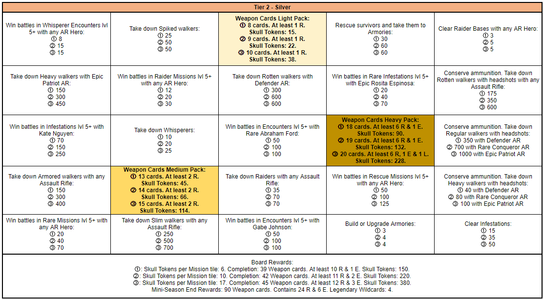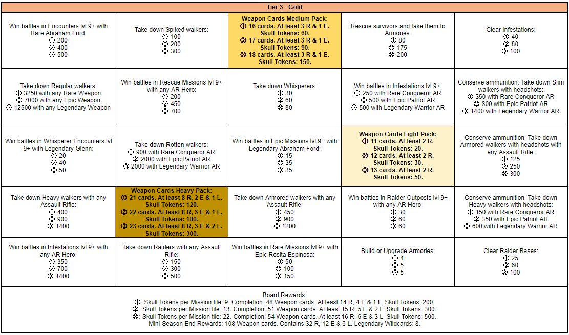 Between the 17th of September and the 23rd of September a Mini-Season themed around Assault Rifles will be available.This Mini-Season has only 1 round and will consist of 5 Tiers and a bonus Mystery Tier of 3 boards each. Each tier will have a different difficulty level as follows Tier 1: Bronze, Tier 2: Silver, Tier 3: Gold, Tier 4: Champion, Tier 5: Ultimate, Tier 6: Mystery. Upon completing Tier 5 you will unlock the Mystery Tier which can be replayed an unlimited amount of times.