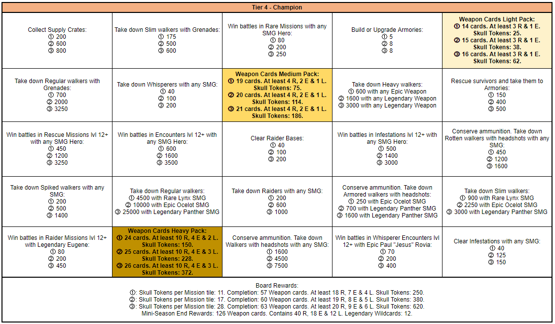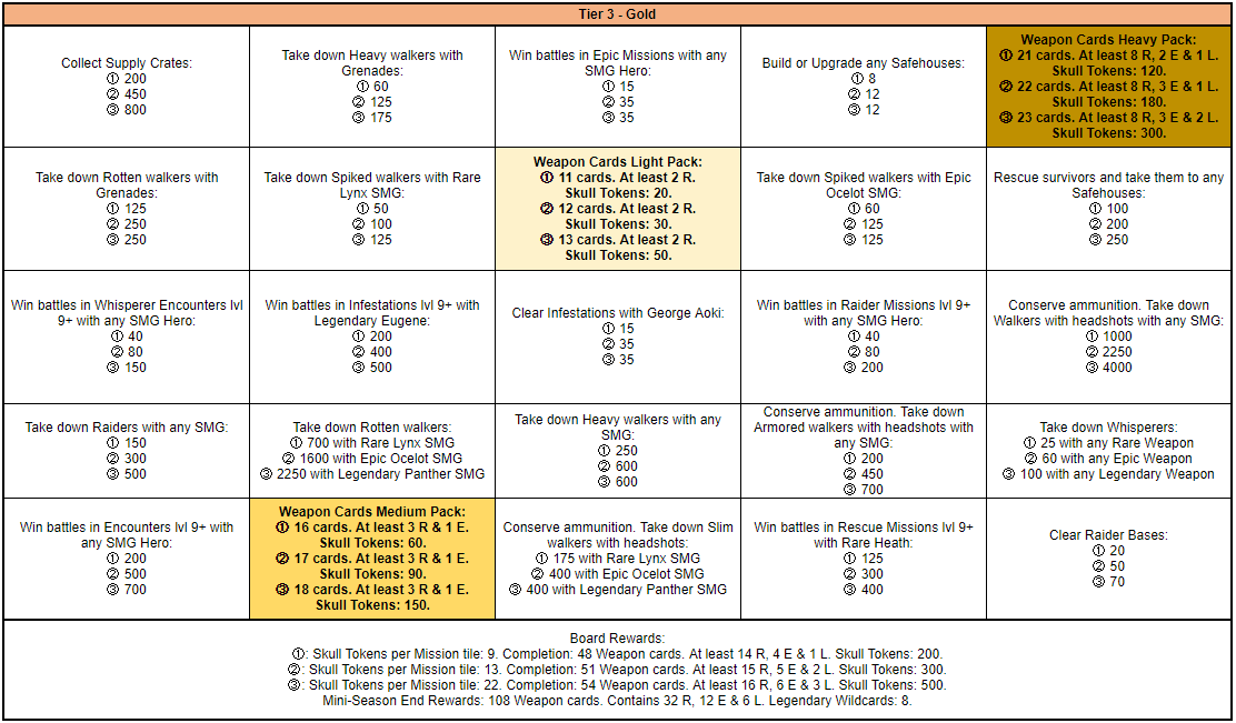 Between the 5th of November and the 11th of November a Mini-Season themed around SMGs will be available.This Mini-Season has only 1 round and will consist of 5 Tiers and a bonus Mystery Tier of 3 boards each. Each tier will have a different difficulty level as follows Tier 1: Bronze, Tier 2: Silver, Tier 3: Gold, Tier 4: Champion, Tier 5: Ultimate, Tier 6: Mystery. Upon completing Tier 5 you will unlock the Mystery Tier which can be replayed an unlimited amount of times.