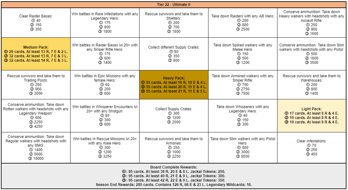 - Legendary Jackal LMG -> Exchange 2000 Jackal Tokens for 19 cards. After this, you can exchange 2100, 2200 and 2300 Jackal Tokens for 22, 25 and 28 cards respectively.